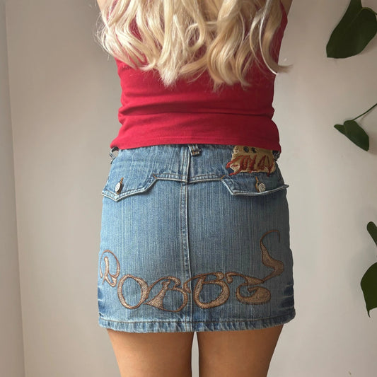 Miss Gang Embroidered Denim Skirt - 29W UK 10 Blue Cotton