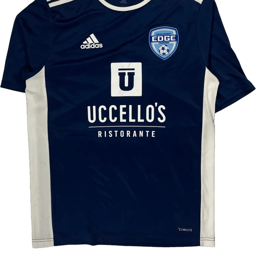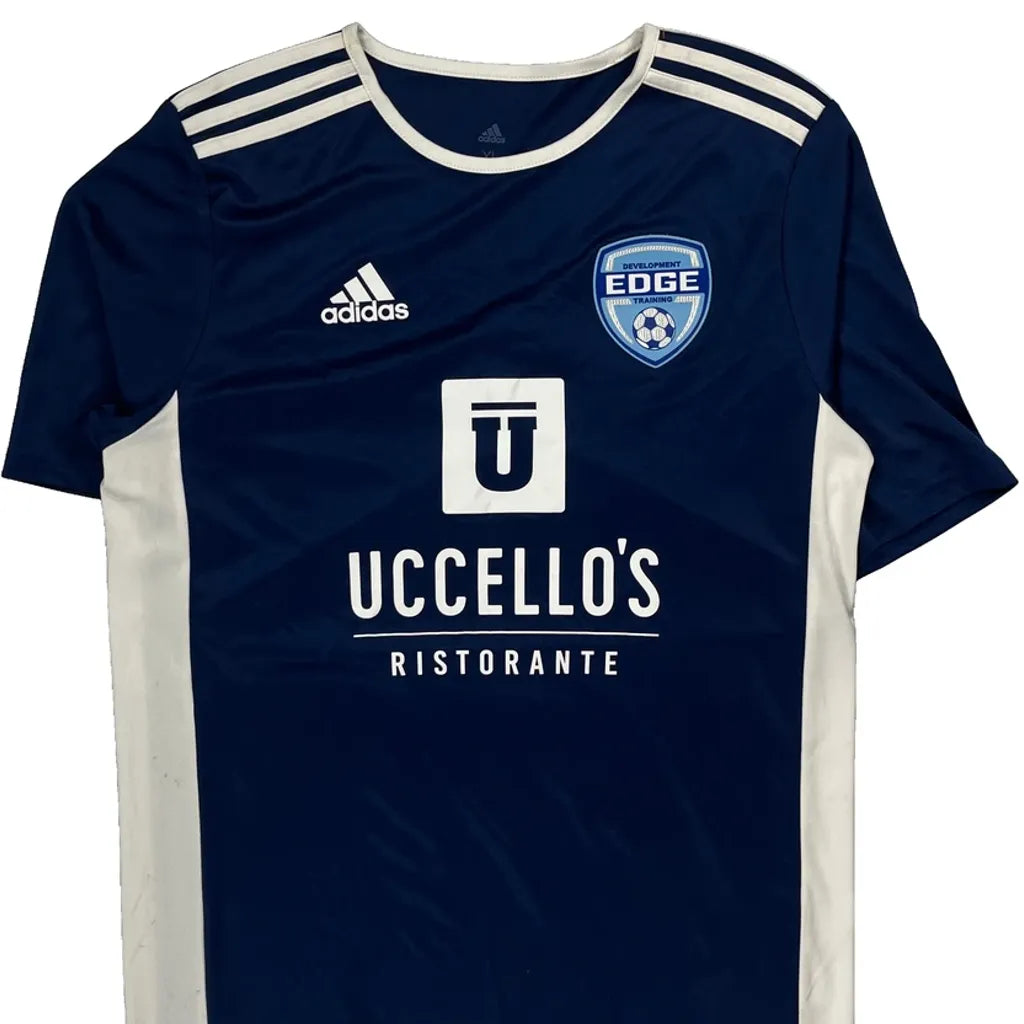 Blue And White Football Jersey With Edge Logo And Uccello'S Ristorante Sponsor