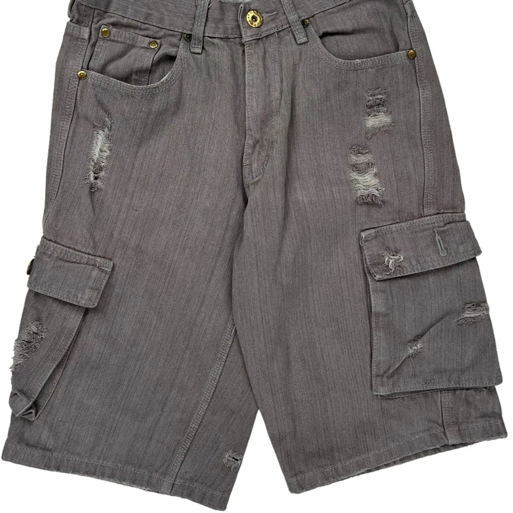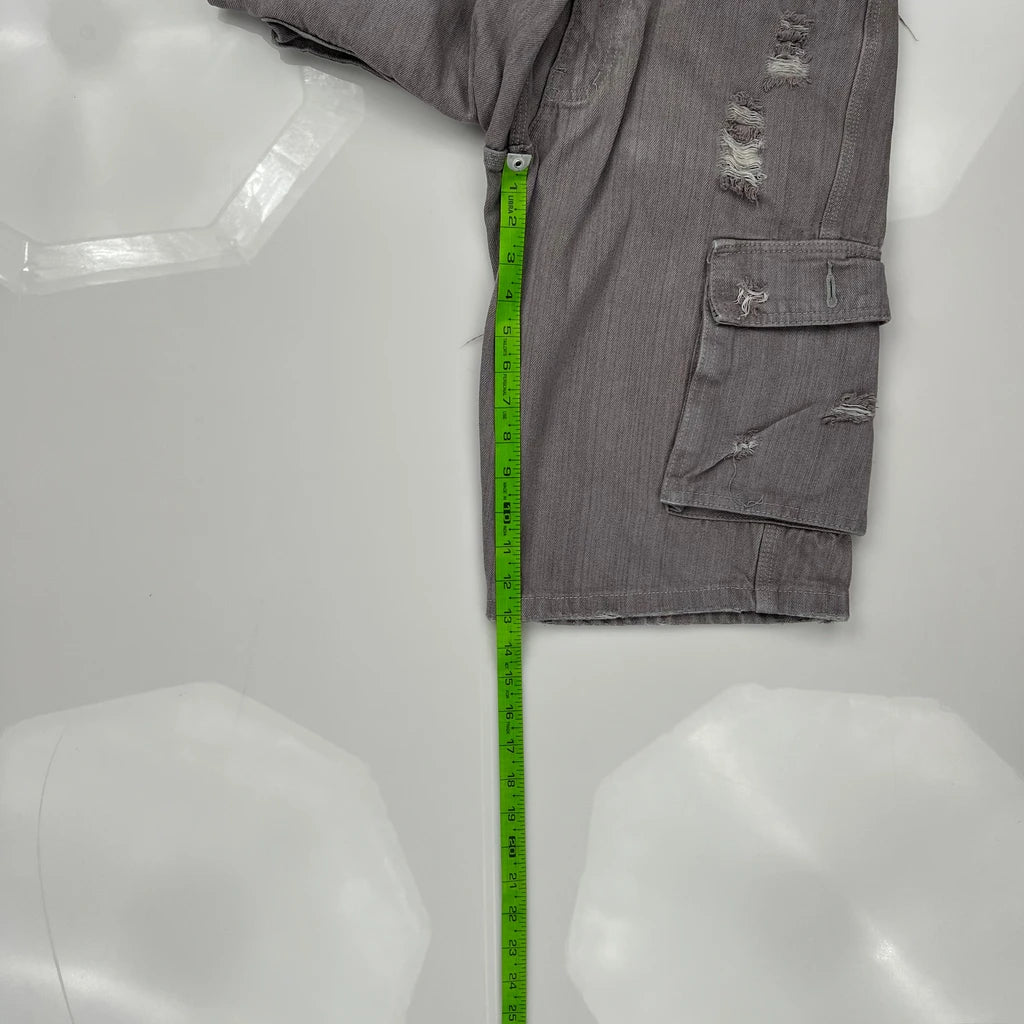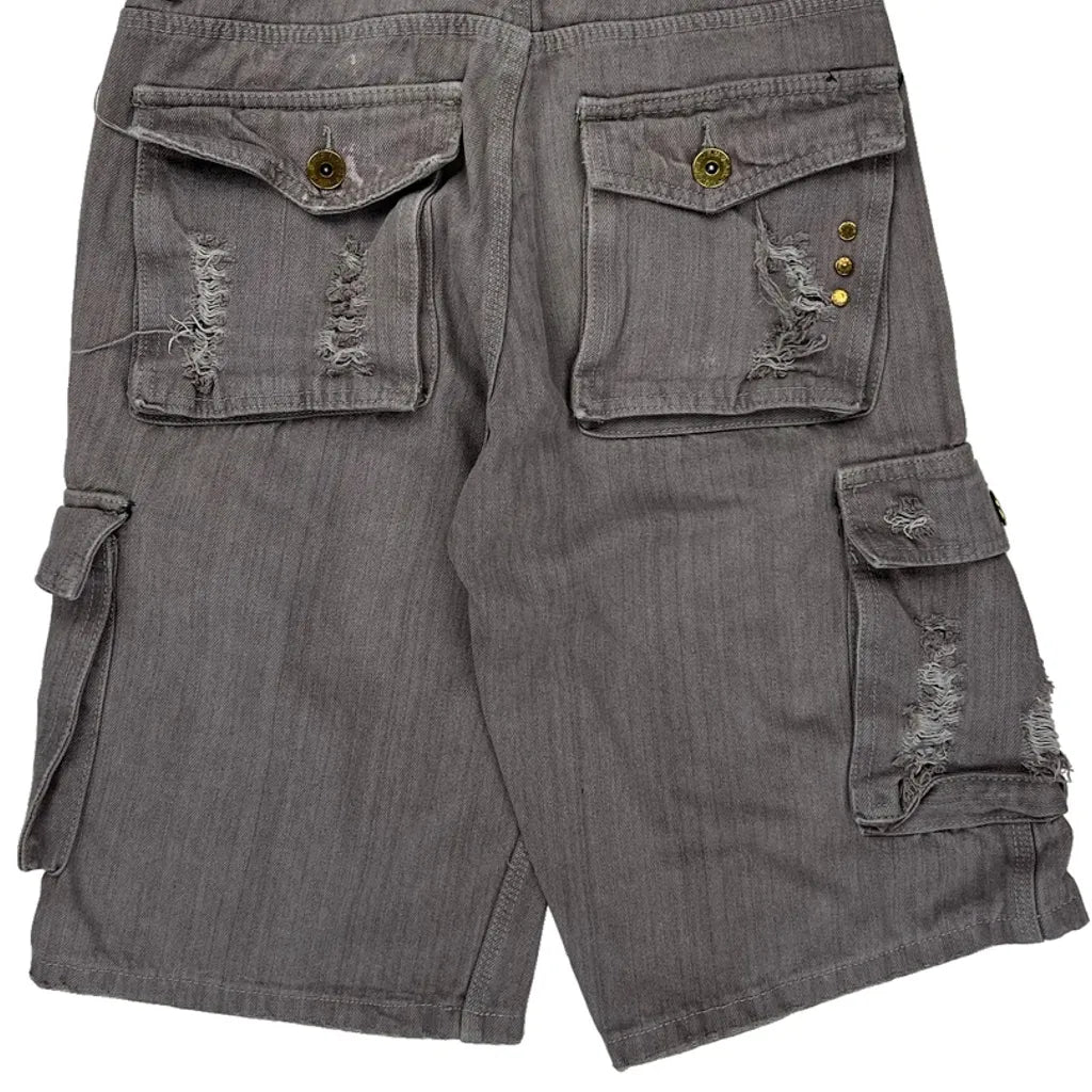 Distressed Grey Cargo Shorts With Multiple Pockets And Button Details.