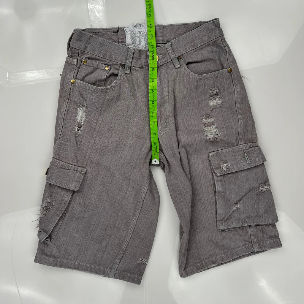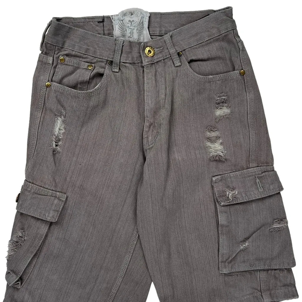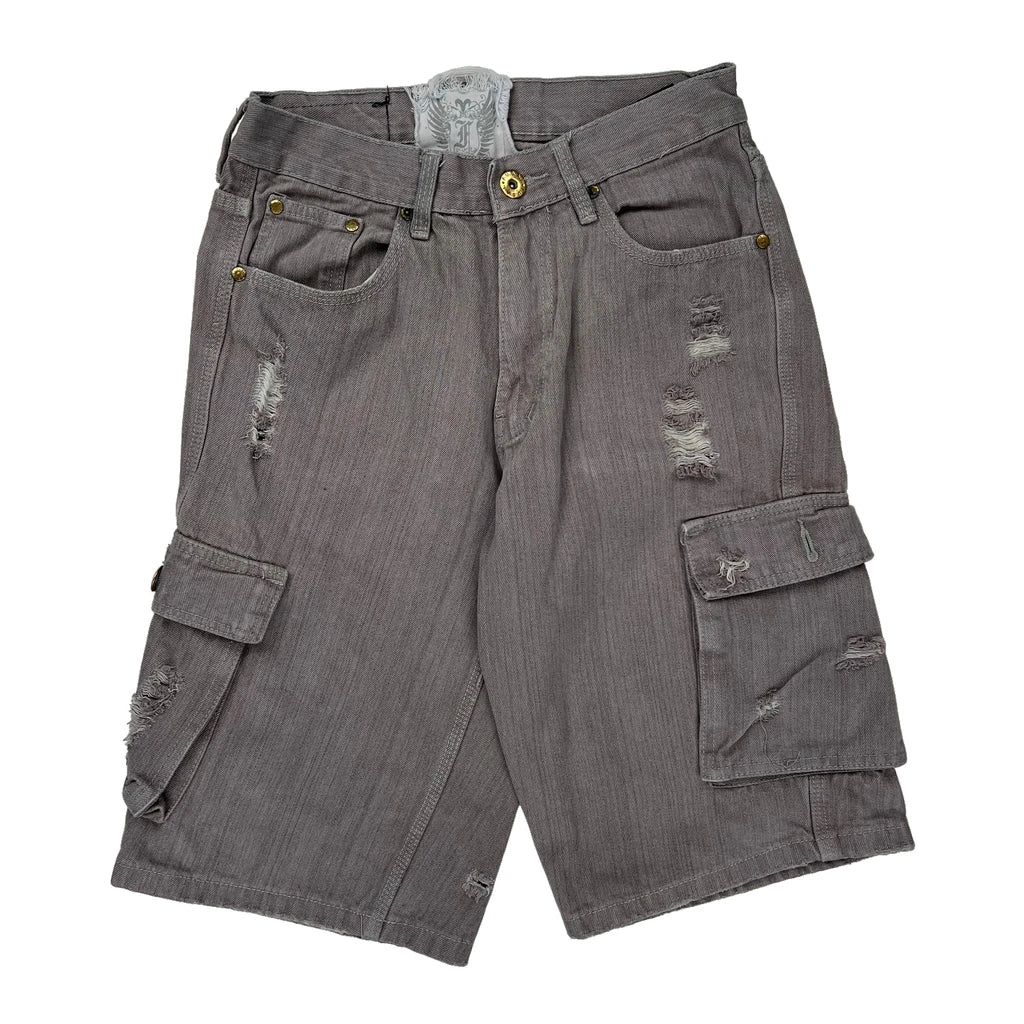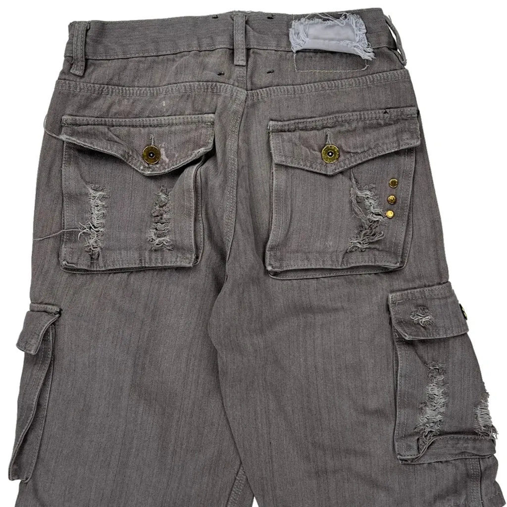 Distressed Grey Cargo Shorts With Multiple Pockets And Button Details.