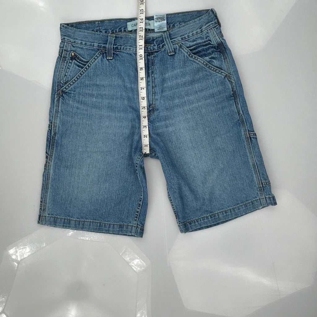 Light Wash Denim Carpenter Shorts With Double Knee And Multiple Pockets.