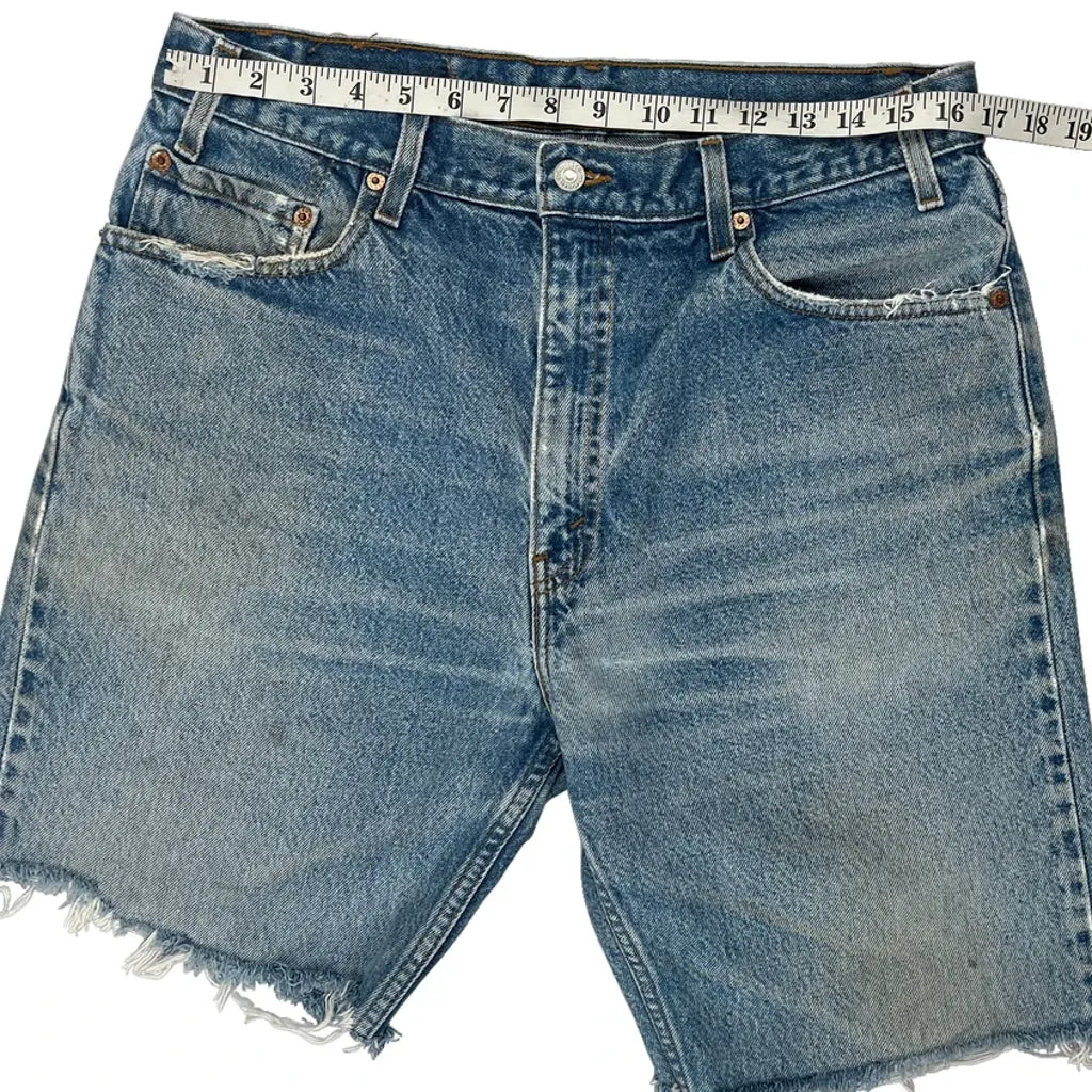 Levis Denim Shorts, fit a 32″ Waist and 9″ inseam.