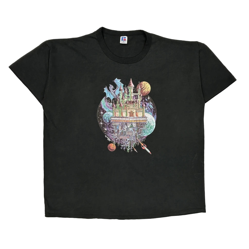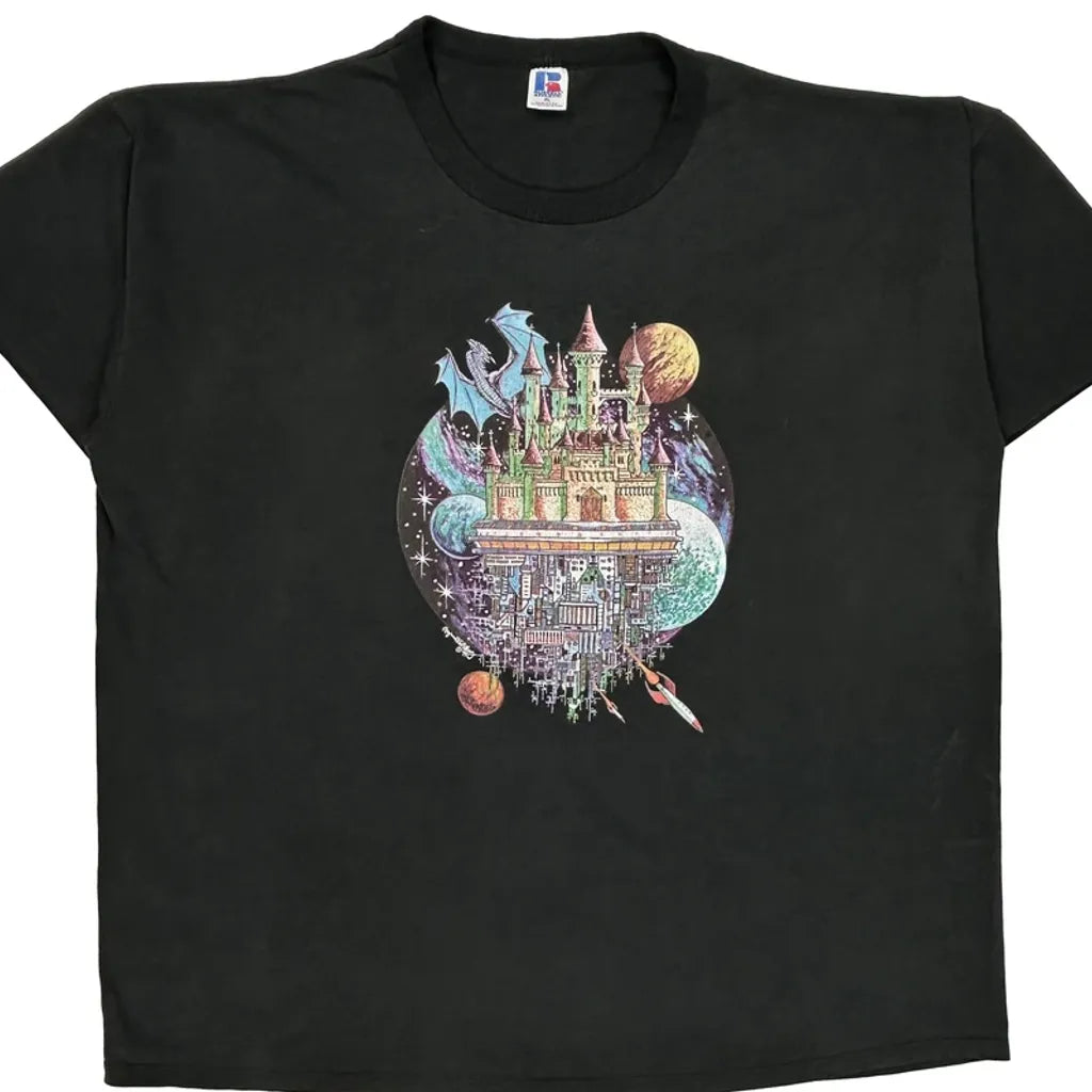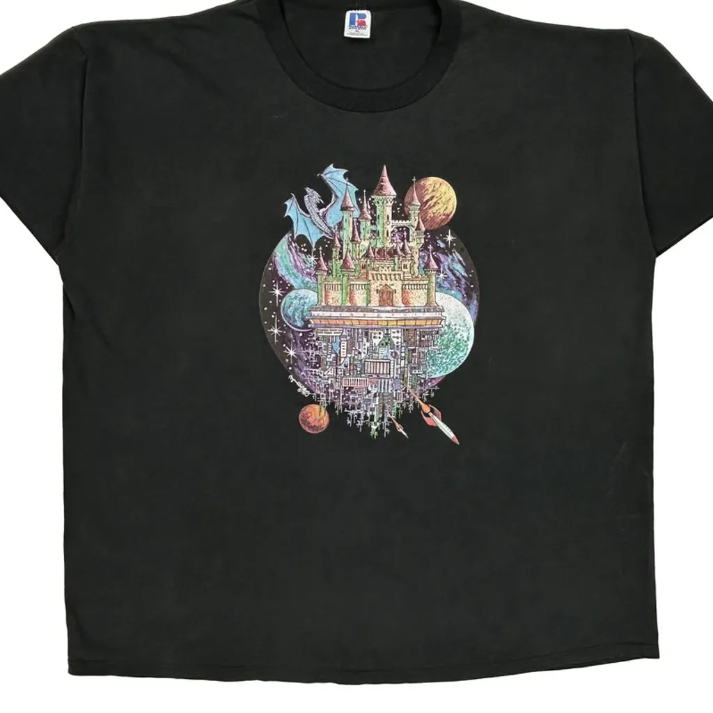 Black T-Shirt With A Colorful Graphic Of A Castle And Planets. No Visible Marks Or Faults.