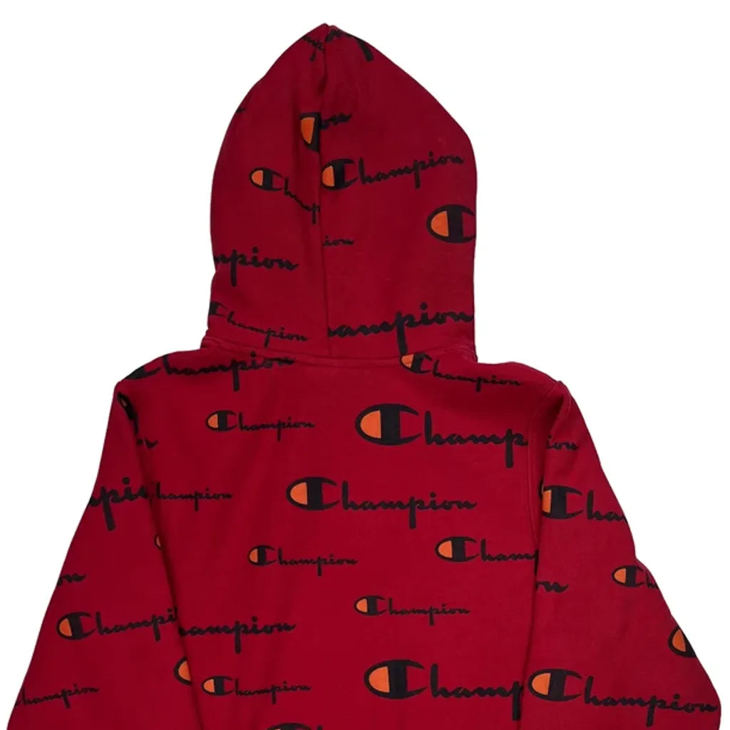 Red Hoodie With Champion Spellout Logo Pattern