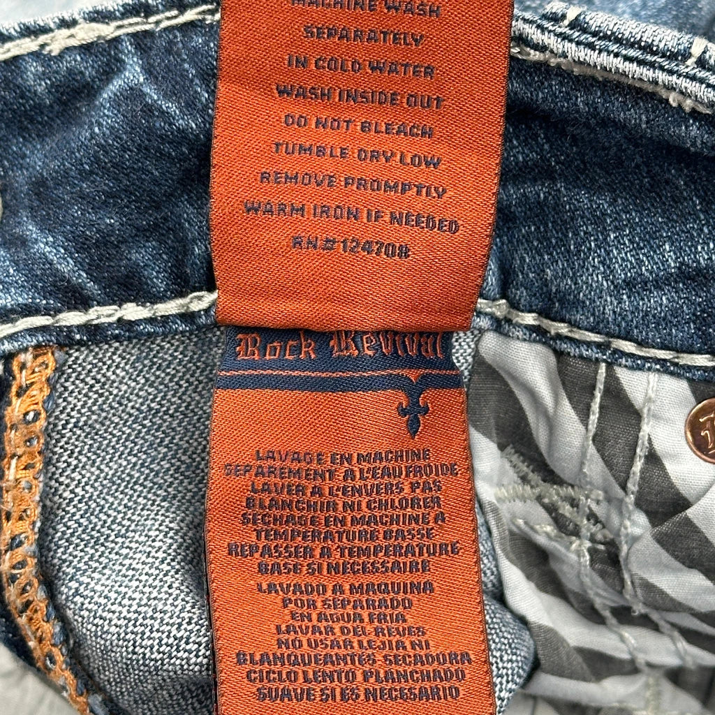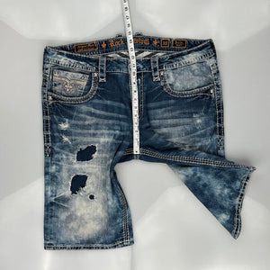 Rock Revival Denim Shorts, fit a 42″ Waist and 14″ inseam.