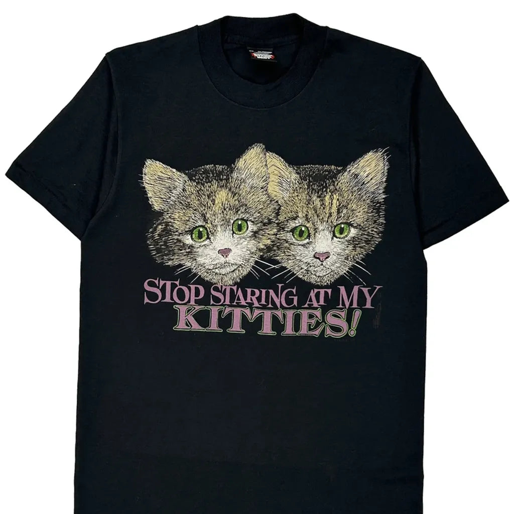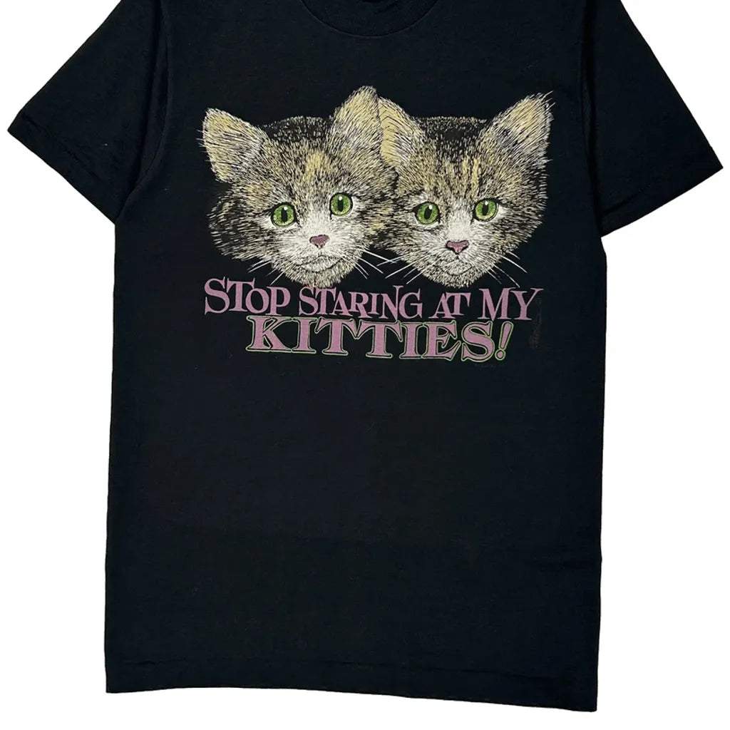 Black T-Shirt With A Graphic Of Three Kittens And The Text 'Stop Staring At My Kitties!'
