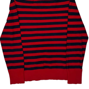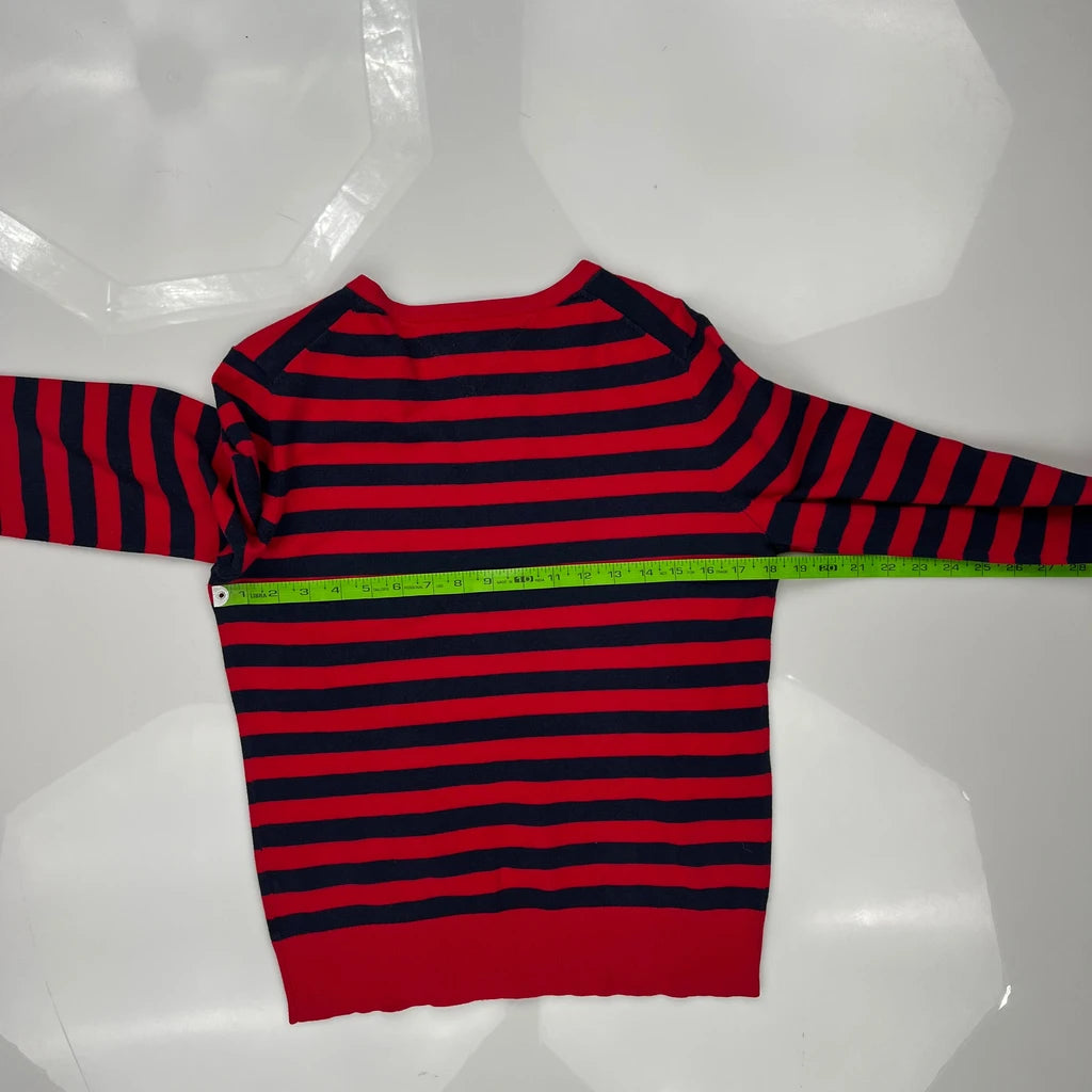 Red And Navy Striped Long Sleeve T-Shirt With V-Neck.