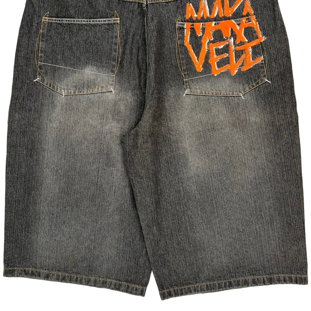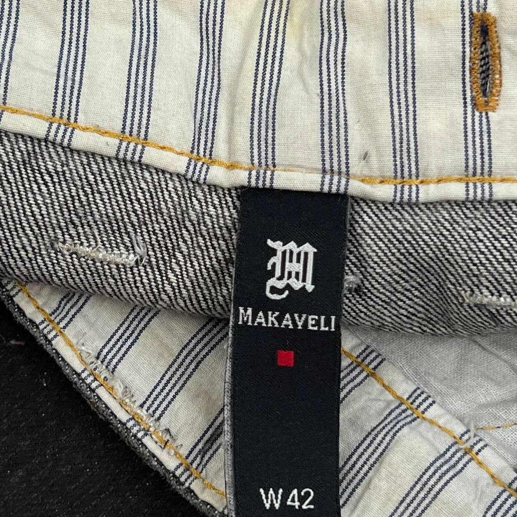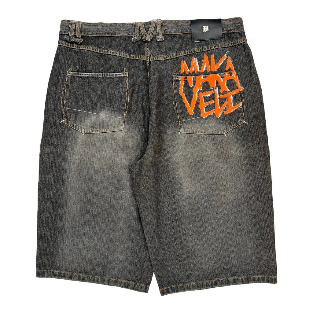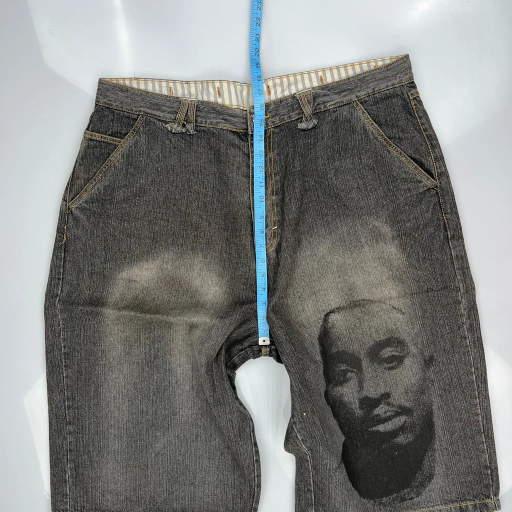 Tupac Markaveli Denim Shorts, fit a 44″ Waist and 13″ inseam.