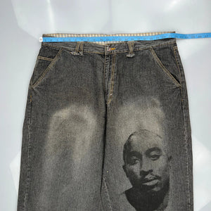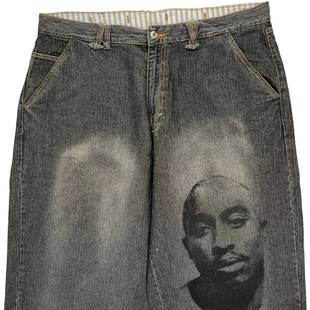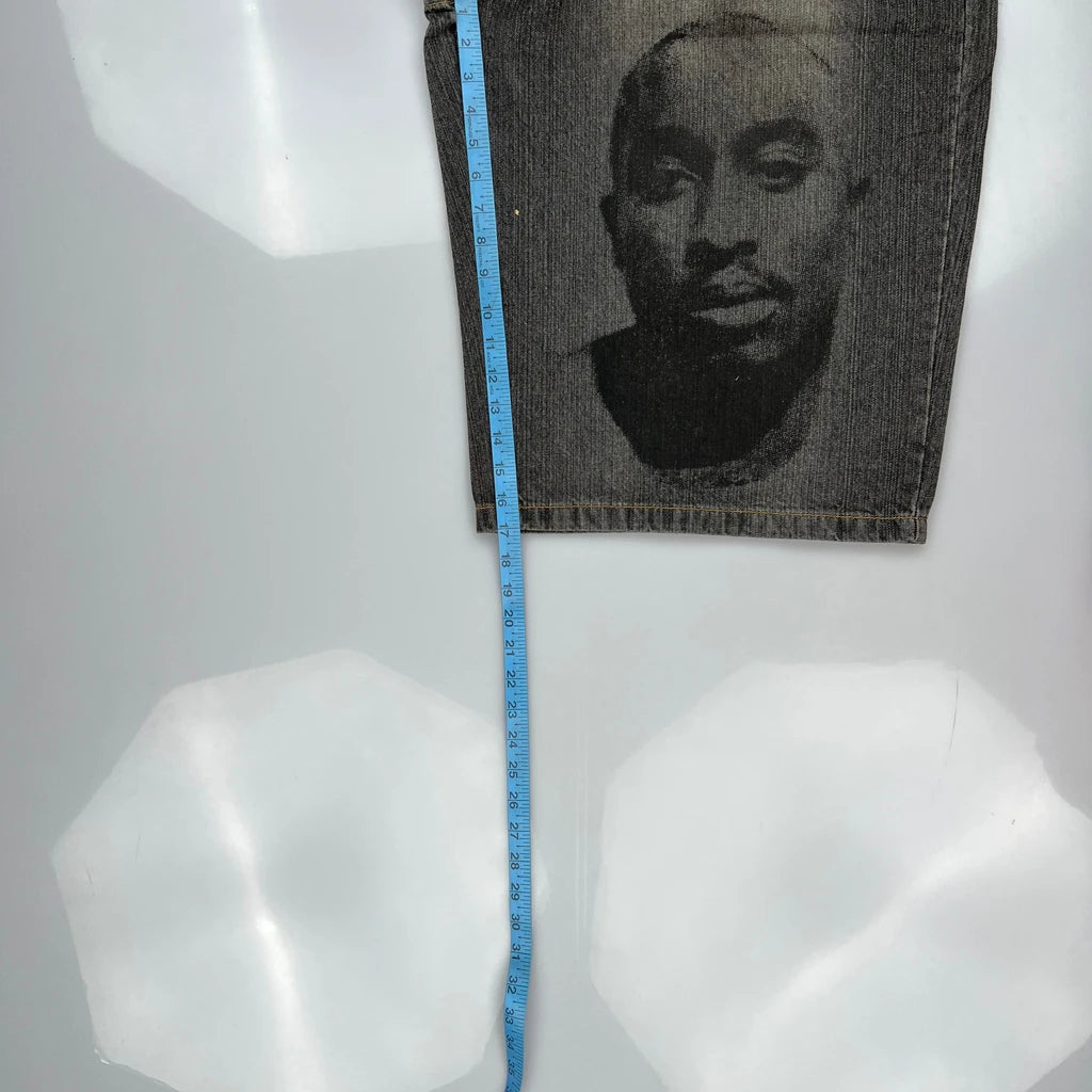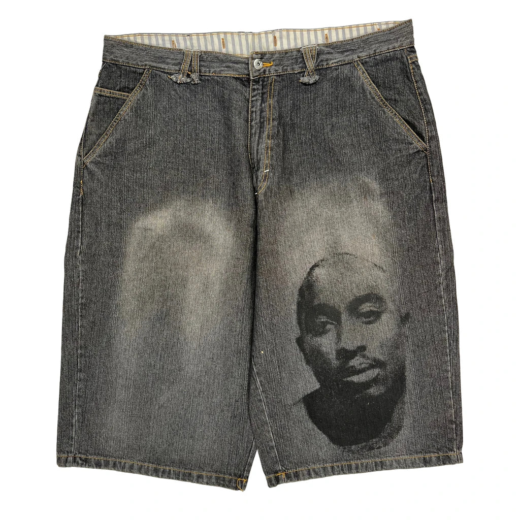 Tupac Markaveli Graphic Denim Shorts - 44W 13L Grey Cotton