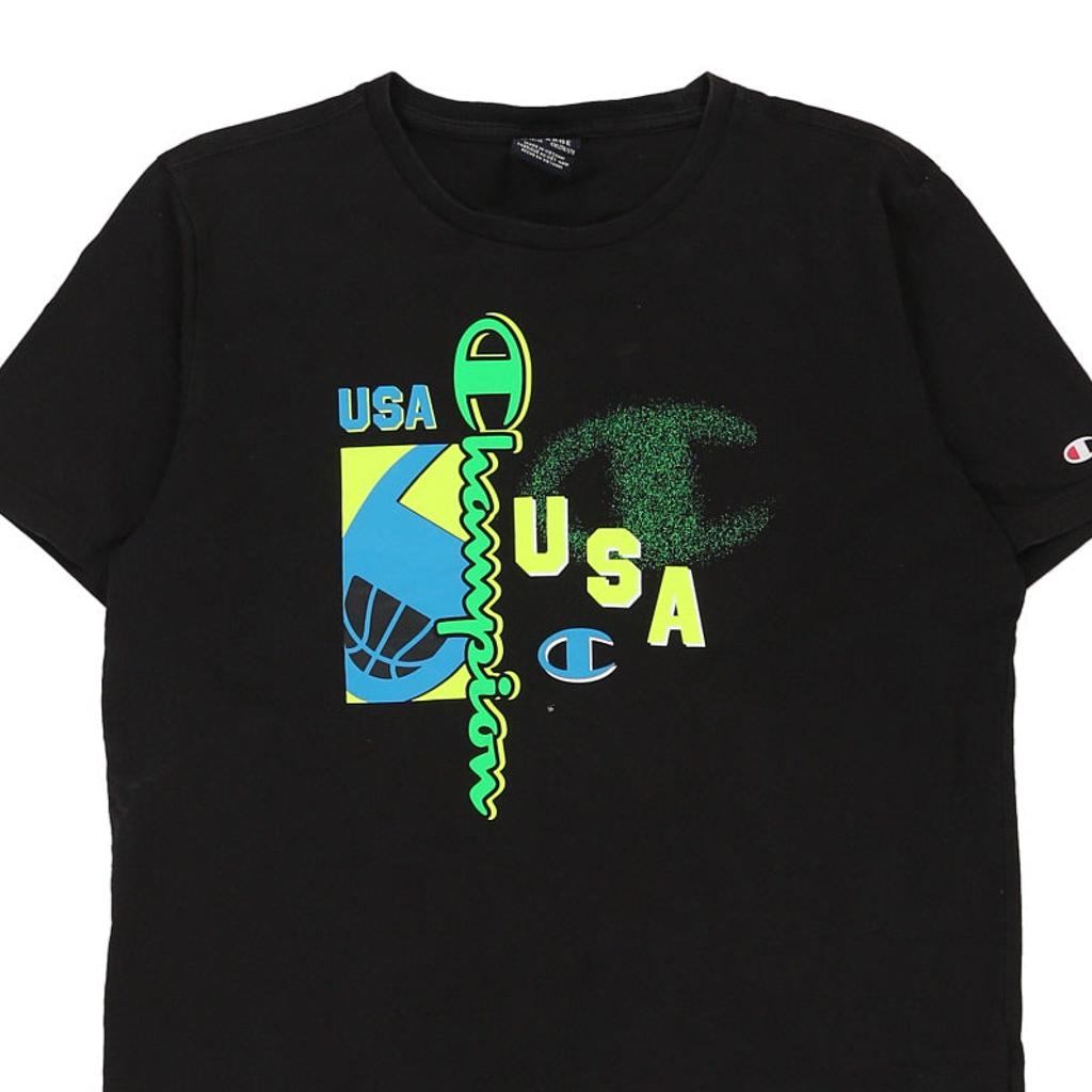 Vintage Age 15-16 black Champion t-shirt, fits xx-large.