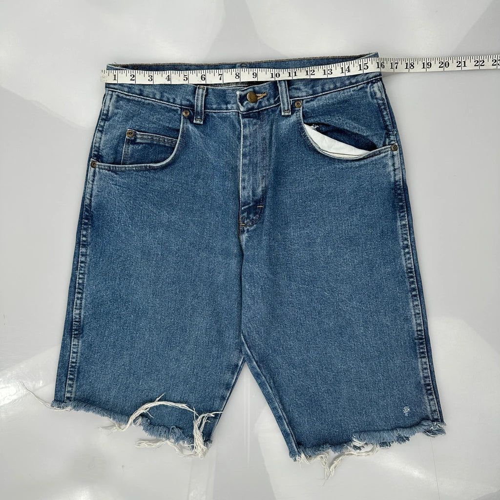 Wrangler Denim Shorts, fit a 32″ Waist and 10″ inseam.