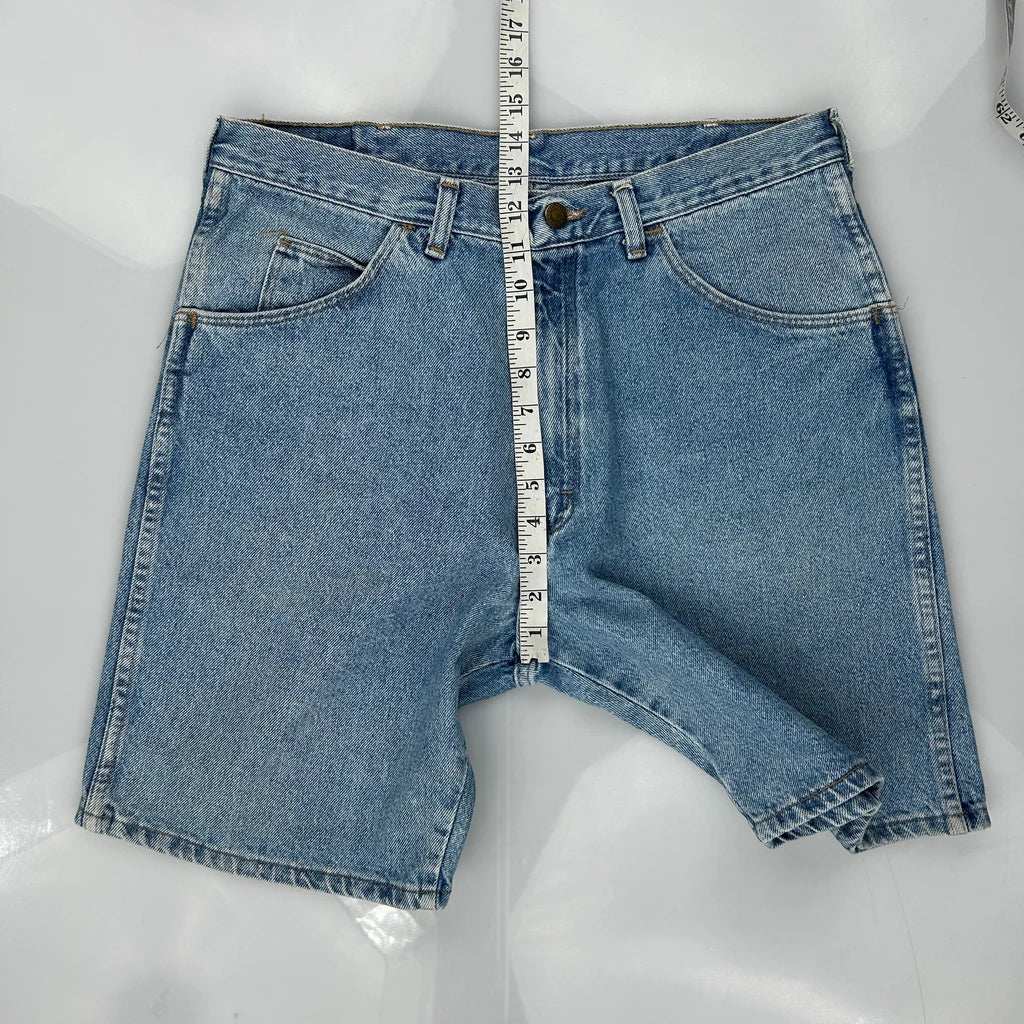 Wrangler Denim Shorts, fit a 34″ Waist and 9″ inseam.